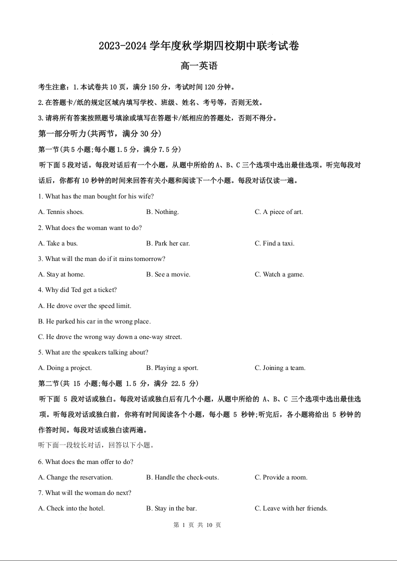 江苏省无锡市江阴市四校2023-2024学年高一上学期11月期中联考英语