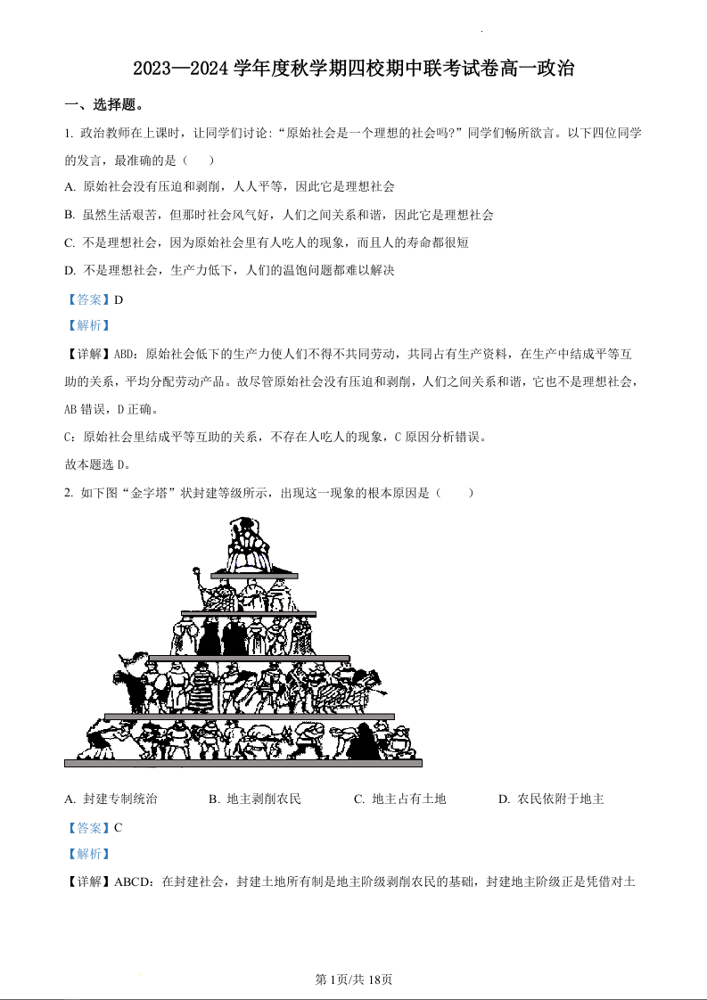 江苏省无锡市江阴市四校2023-2024学年高一上学期11月期中联考政治(精品解析版)
