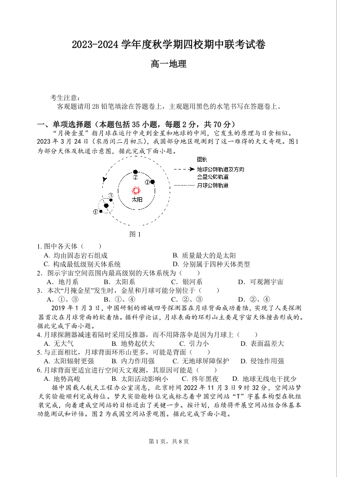 江苏省无锡市江阴市四校2023-2024学年高一上学期11月期中联考地理