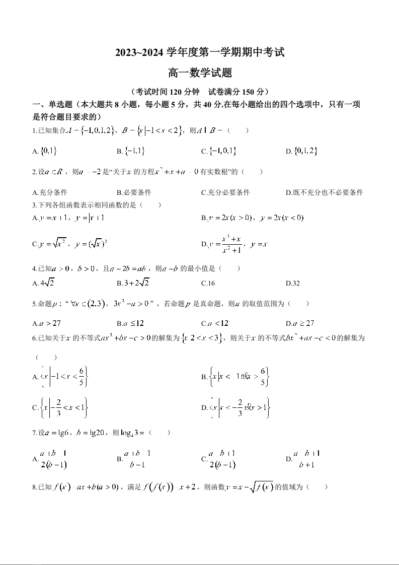 江苏省徐州市2023-2024学年高一上学期11月期中考试数学