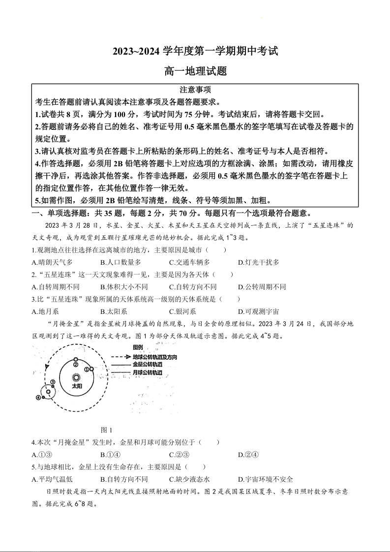 江苏省徐州市2023-2024学年高一上学期11月期中考试地理