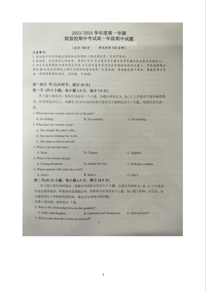 江苏省盐城市联盟校2023-2024学年高一上学期期中联考英语