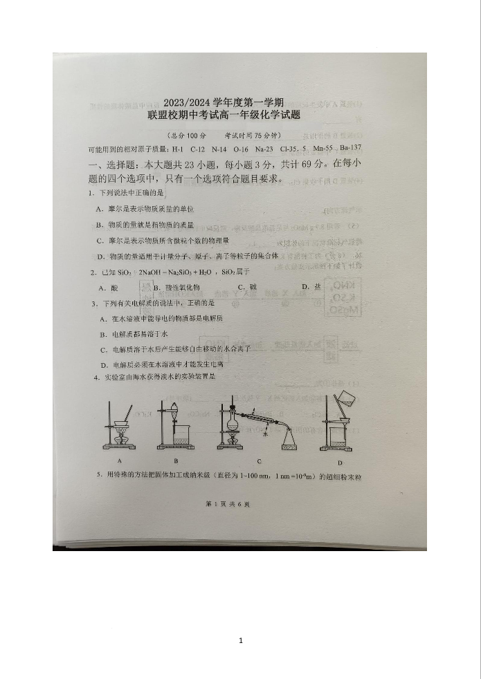 江苏省盐城市联盟校2023-2024学年高一上学期期中联考化学