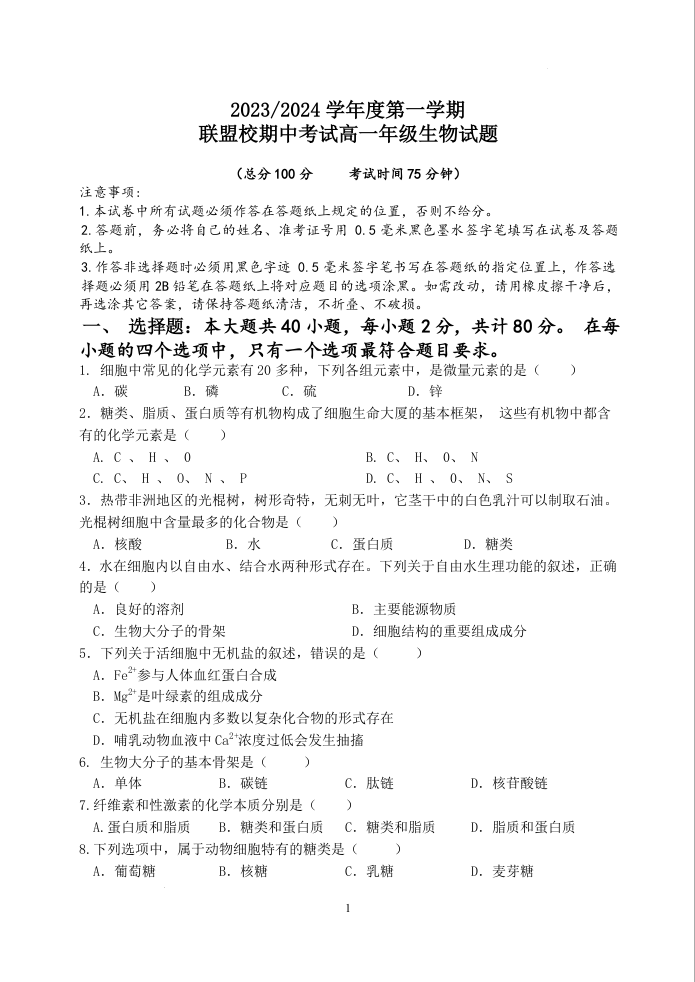 江苏省盐城市联盟校2023-2024学年高一上学期期中联考生物