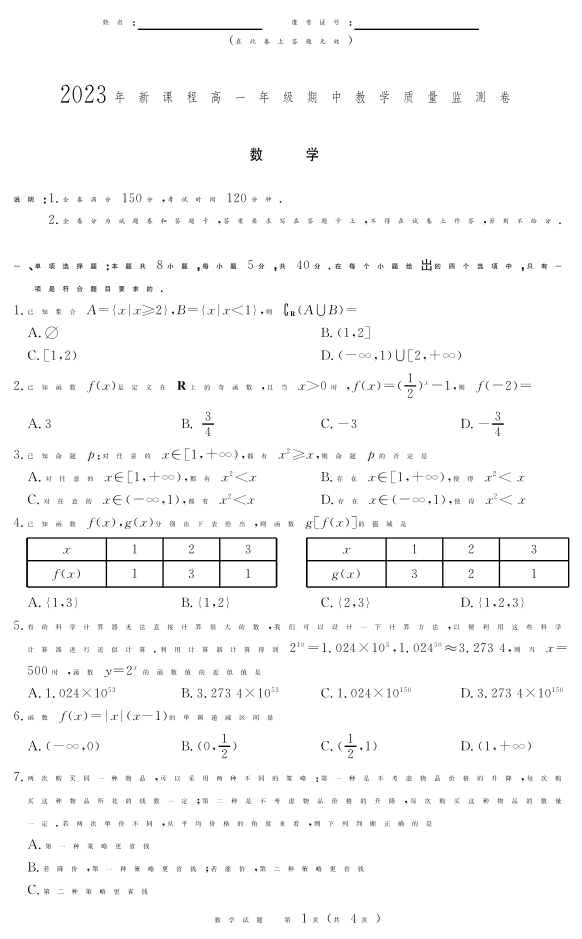 江西省抚州市2023-2024学年高一上学期期中考试数学
