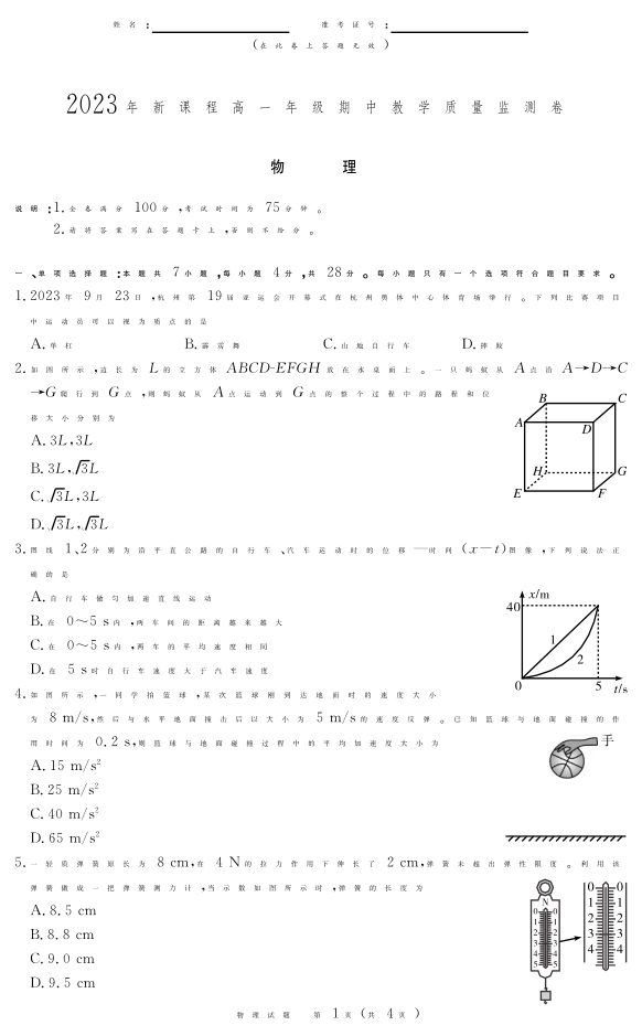 江西省抚州市2023-2024学年高一上学期期中考试物理