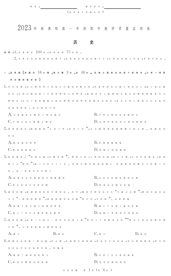 江西省抚州市2023-2024学年高一上学期期中考试历史