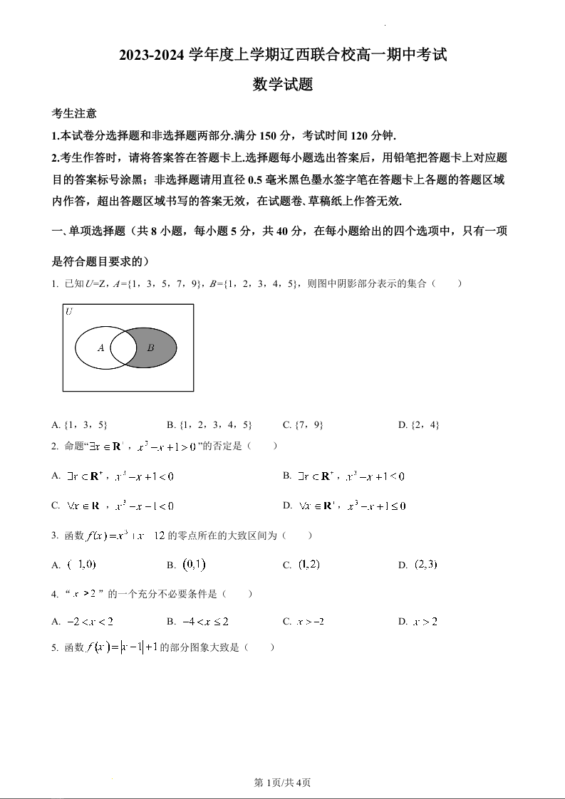 辽宁省辽西联合校2023-2024学年高一上学期期中考试数学(原卷版)