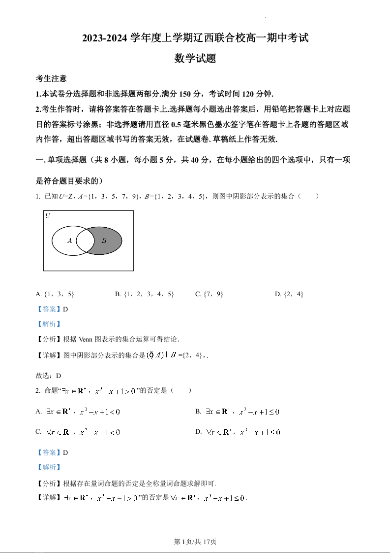 辽宁省辽西联合校2023-2024学年高一上学期期中考试数学(精品解析版)