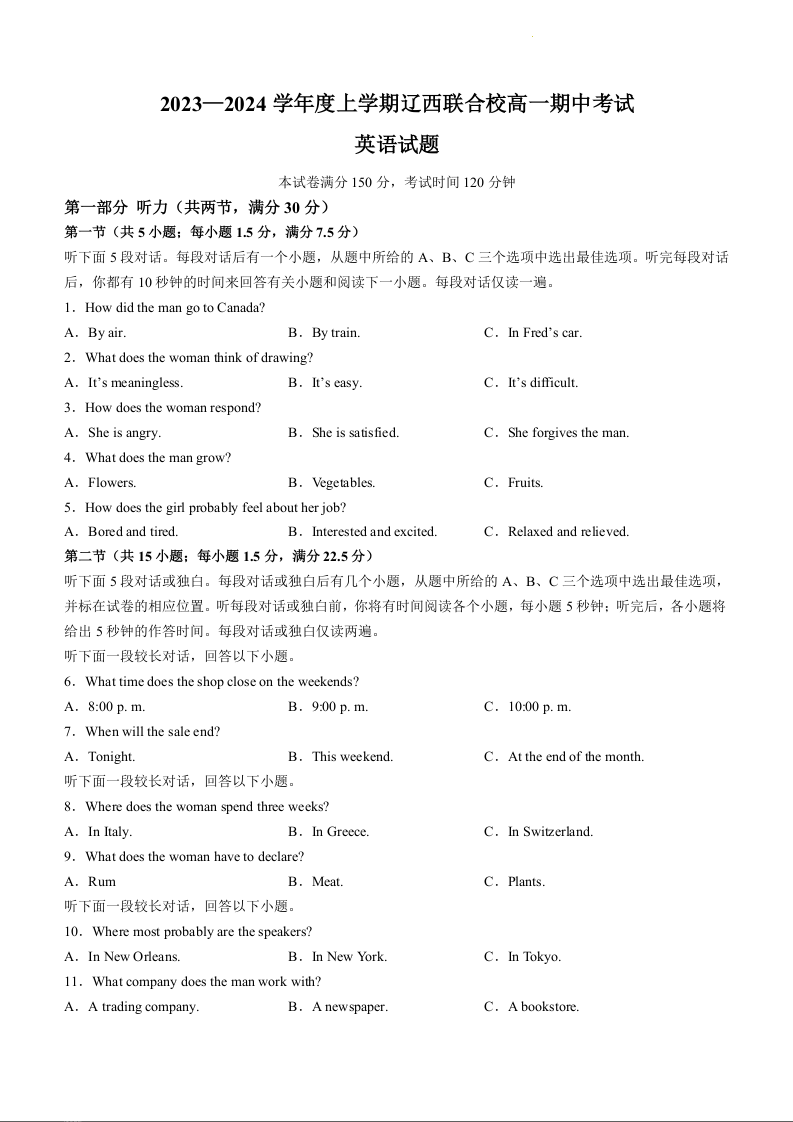 辽宁省辽西联合校2023-2024学年高一上学期期中考试英语+答案
