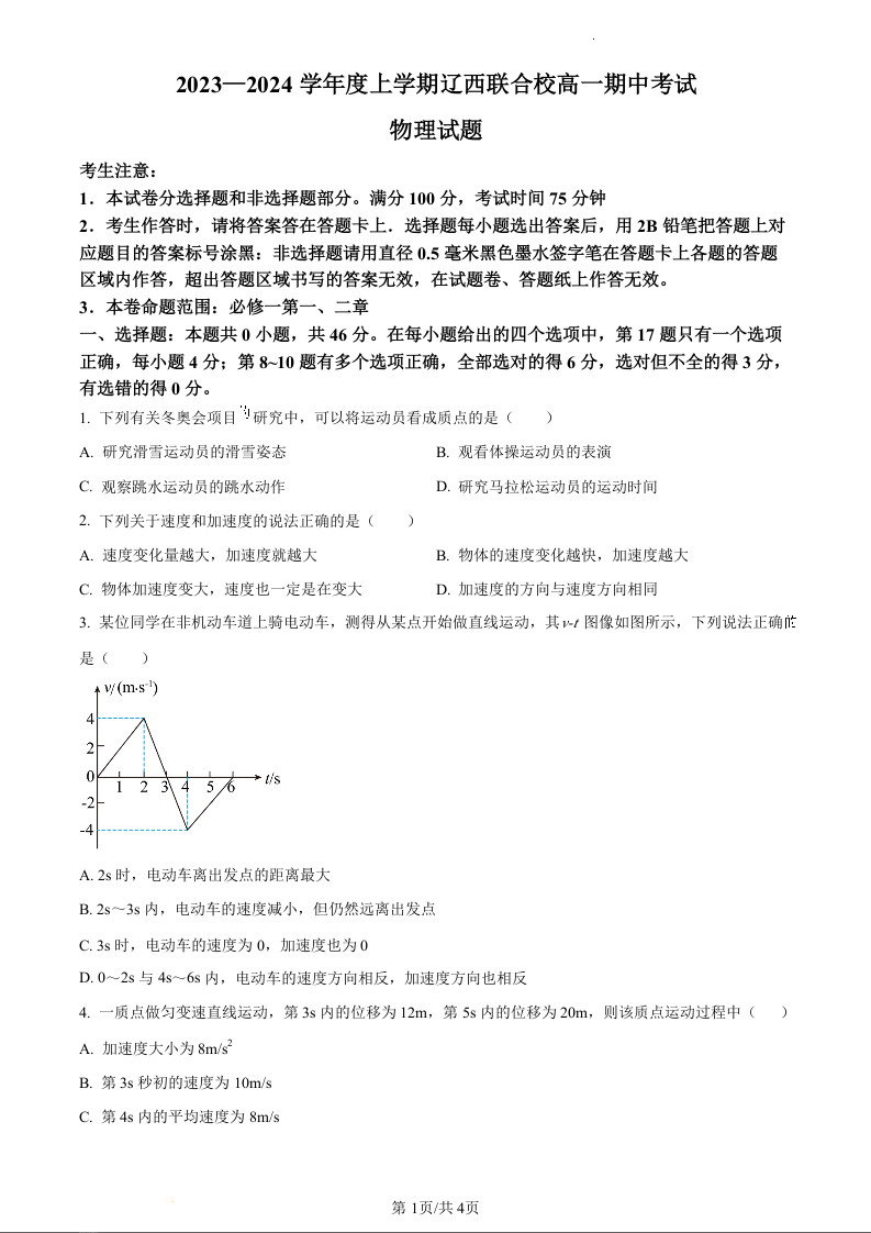 辽宁省辽西联合校2023-2024学年高一上学期期中考试物理(原卷版)