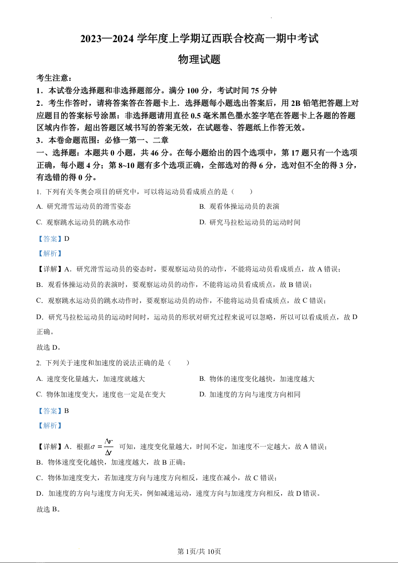 辽宁省辽西联合校2023-2024学年高一上学期期中考试物理(精品解析版)