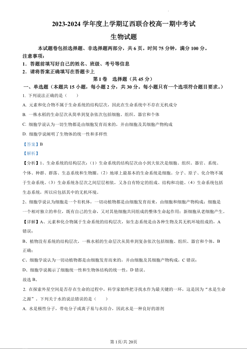 辽宁省辽西联合校2023-2024学年高一上学期期中考试生物(精品解析版)
