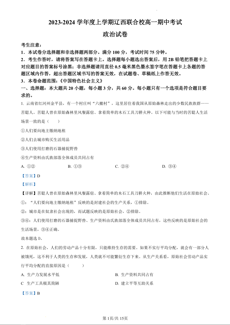 辽宁省辽西联合校2023-2024学年高一上学期期中考试政治(精品解析版)