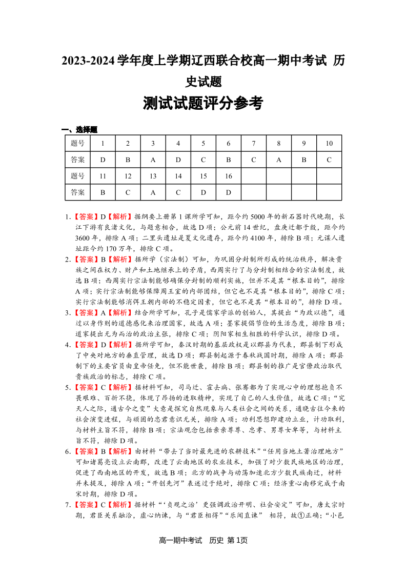 辽宁省辽西联合校2023-2024学年高一上学期期中考试历史答案