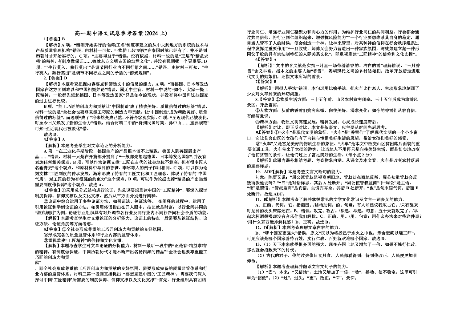 宁夏银川一中2023-2024学年高一上学期期中考试语文答案