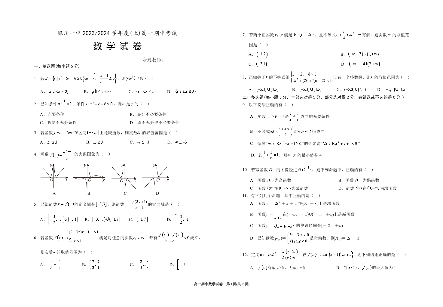 宁夏银川一中2023-2024学年高一上学期期中考试数学