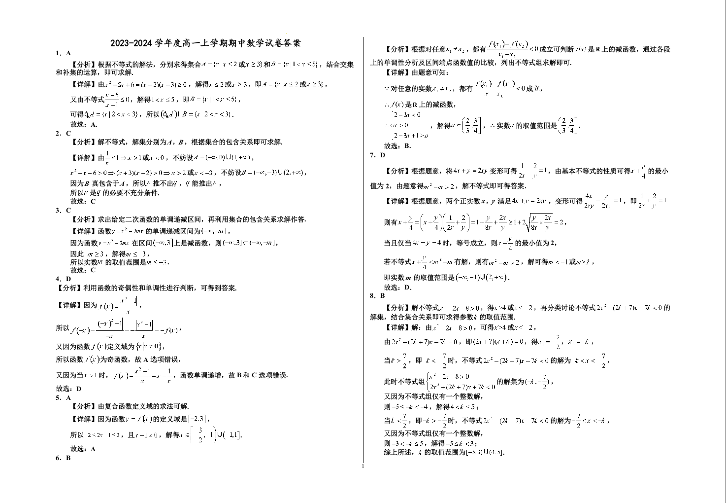 宁夏银川一中2023-2024学年高一上学期期中考试数学答案