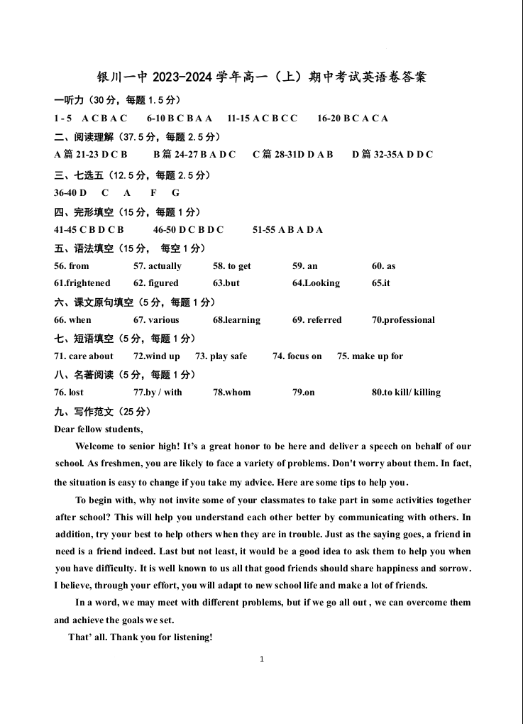 宁夏银川一中2023-2024学年高一上学期期中考试英语答案