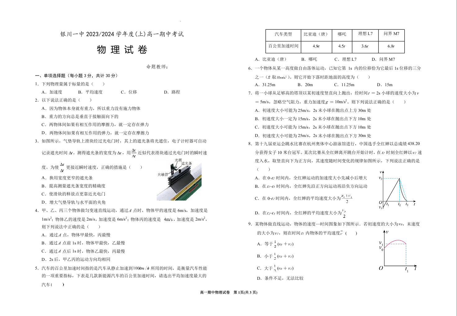 宁夏银川一中2023-2024学年高一上学期期中考试物理