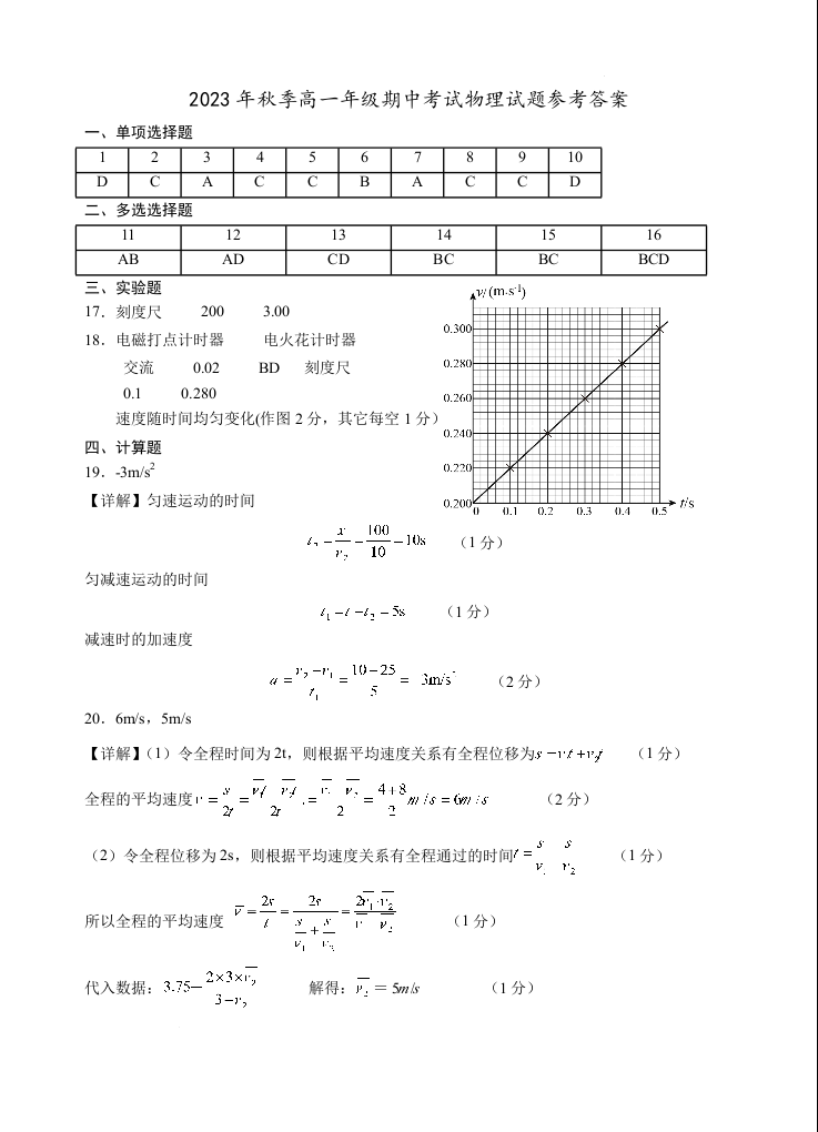 宁夏银川一中2023-2024学年高一上学期期中考试物理答案