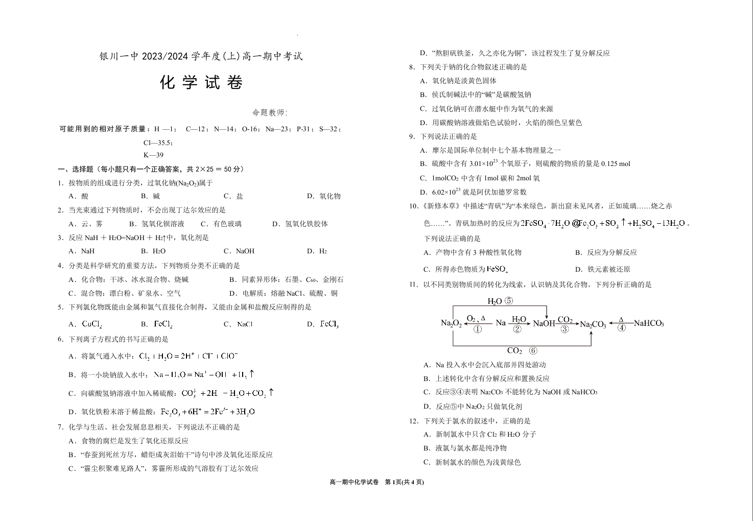 宁夏银川一中2023-2024学年高一上学期期中考试化学
