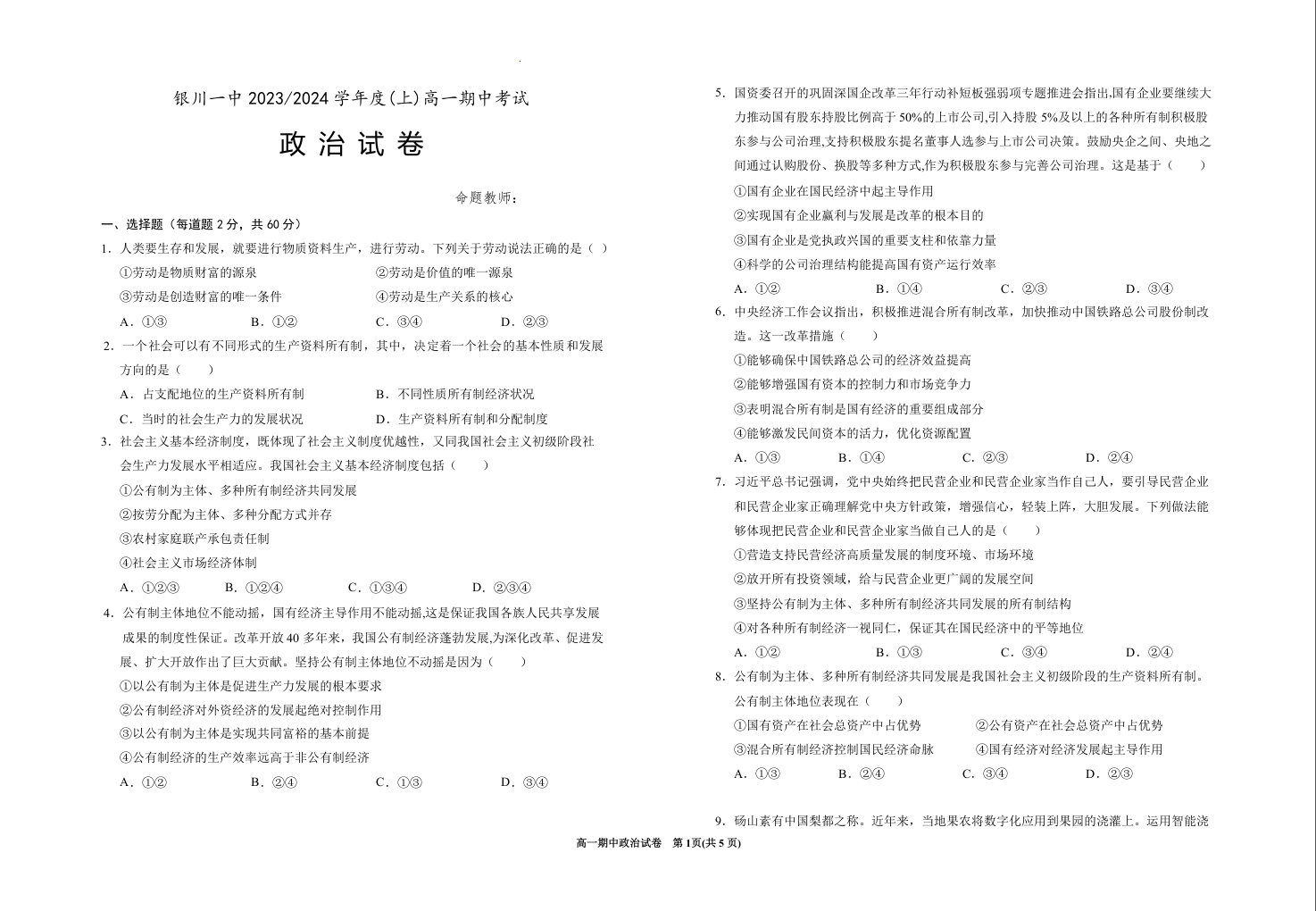 宁夏银川一中2023-2024学年高一上学期期中考试政治