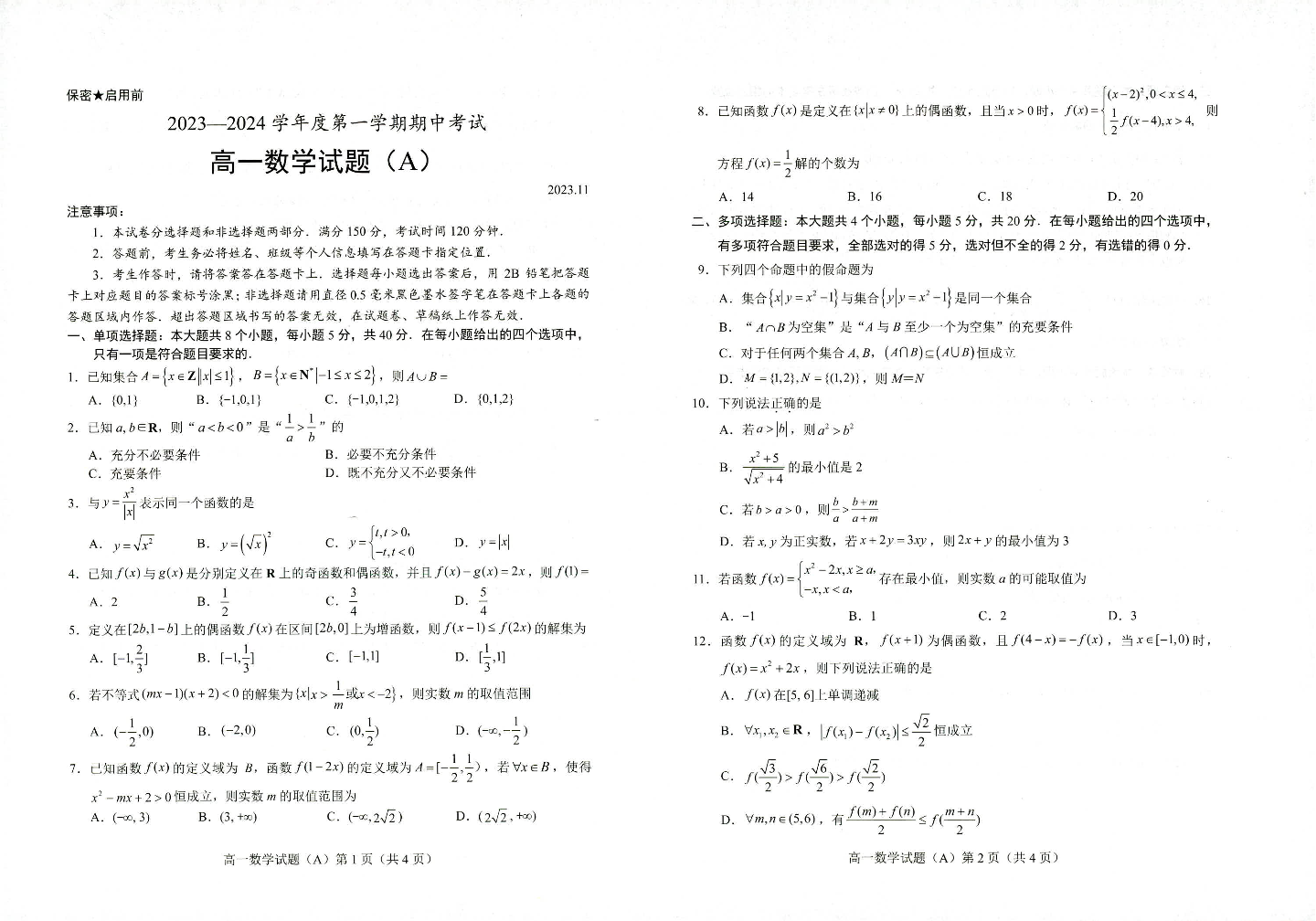 山东省菏泽市2023-2024学年高一上学期11月期中考试数学