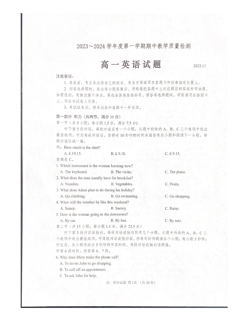 山东省济宁市邹城市2023-2024学年高一上学期11月期中教学质量检测英语+答案
