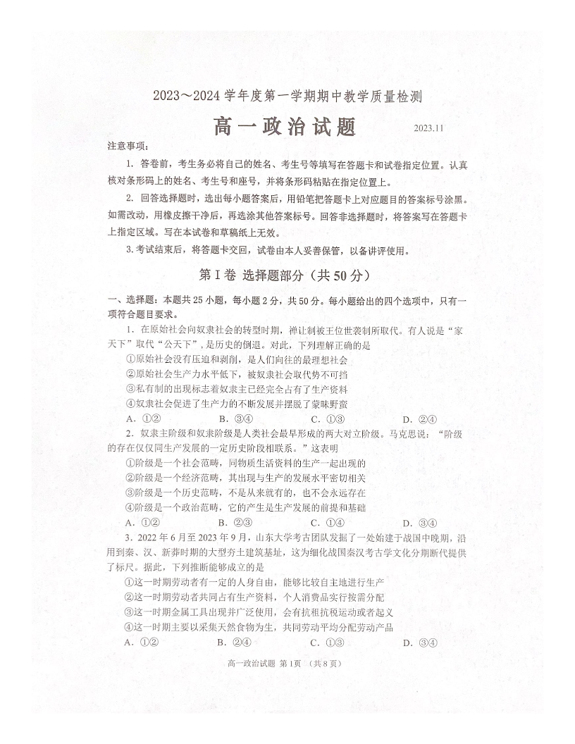 山东省济宁市邹城市2023-2024学年高一上学期11月期中教学质量检测政治+答案