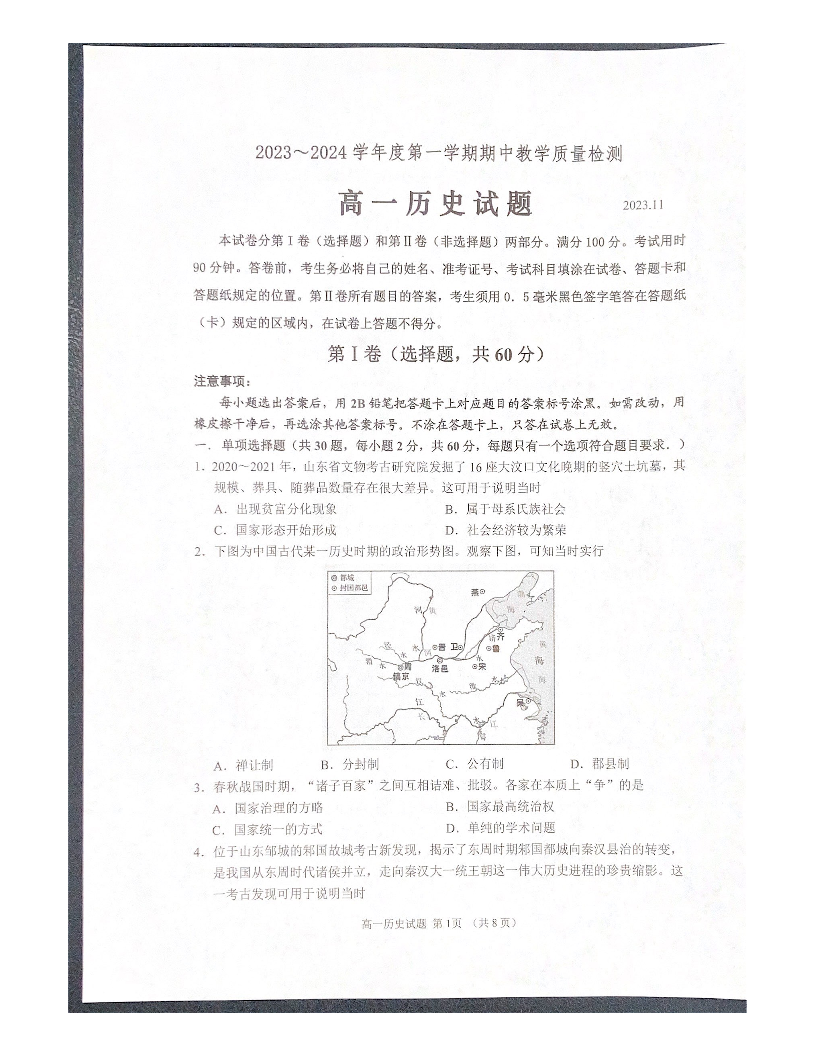 山东省济宁市邹城市2023-2024学年高一上学期11月期中教学质量检测历史+答案