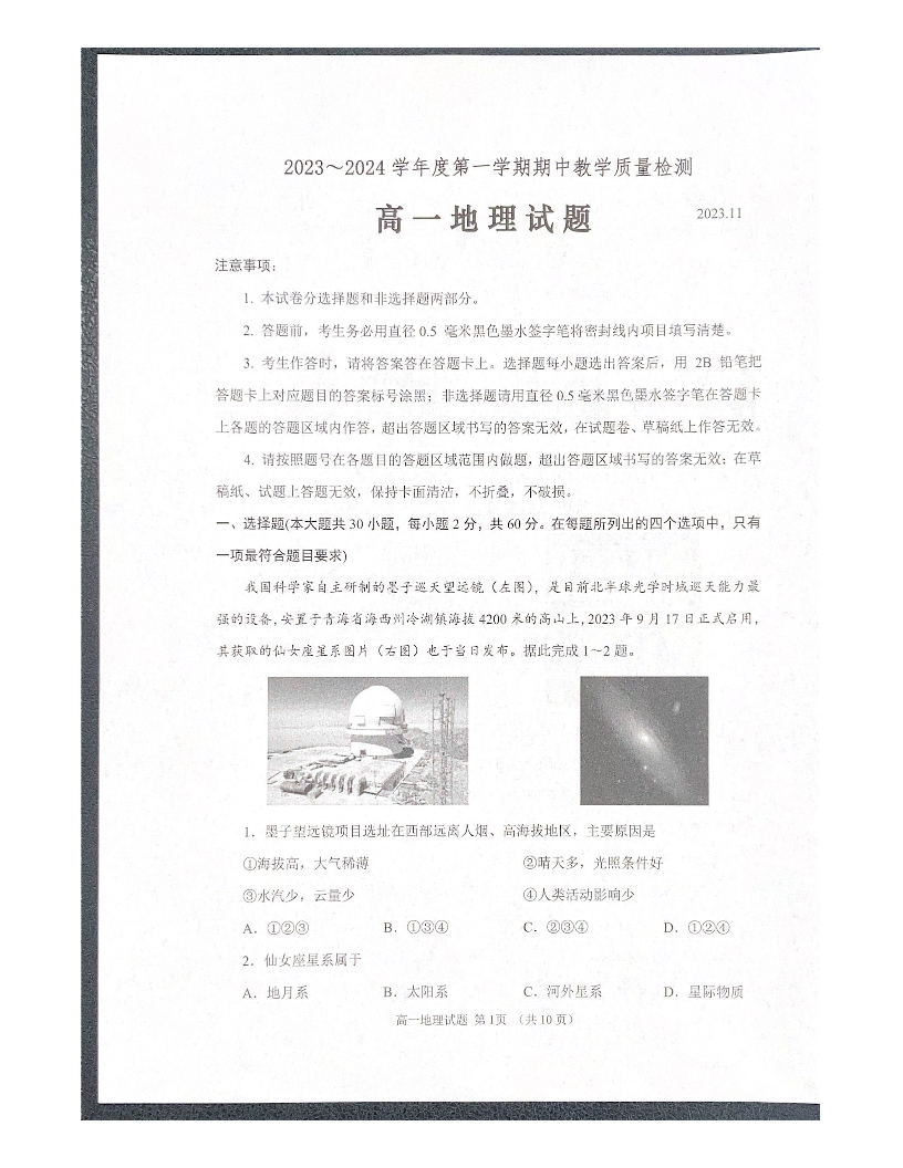 山东省济宁市邹城市2023-2024学年高一上学期11月期中教学质量检测地理+答案