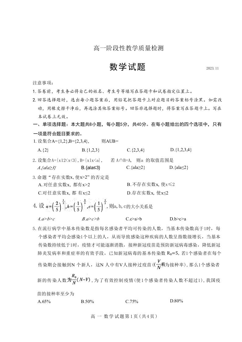 山东省临沂市河东区2023-2024学年高一上学期11月期中考试数学