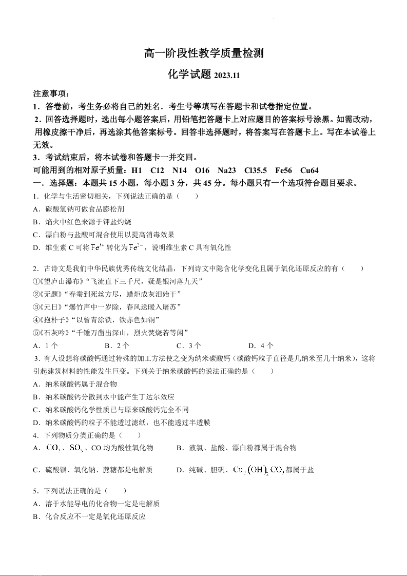 山东省临沂市河东区2023-2024学年高一上学期11月期中考试化学