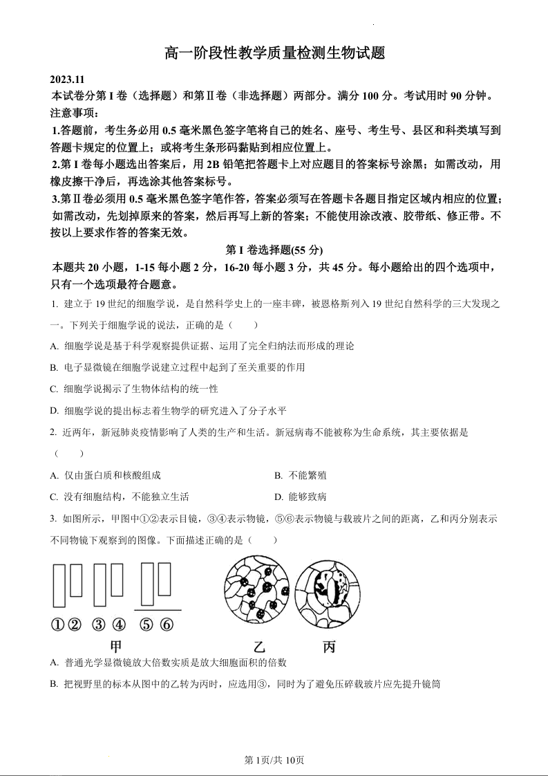 山东省临沂市河东区2023-2024学年高一上学期11月期中考试生物(原卷版)