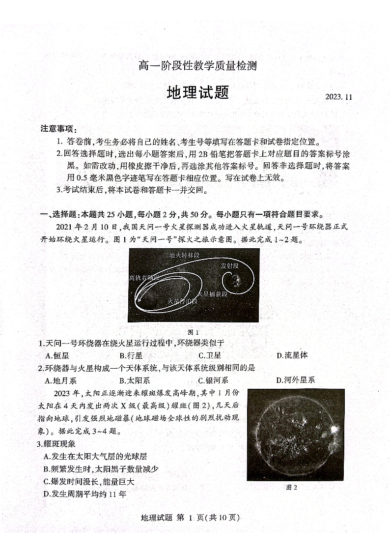 山东省临沂市河东区2023-2024学年高一上学期11月期中考试地理