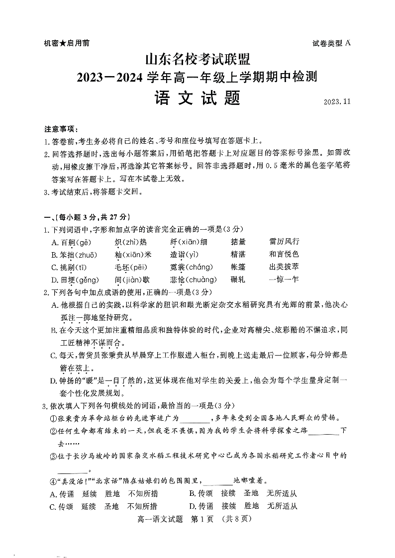 山东省名校考试联盟2023-2024学年高一上学期期中考试语文