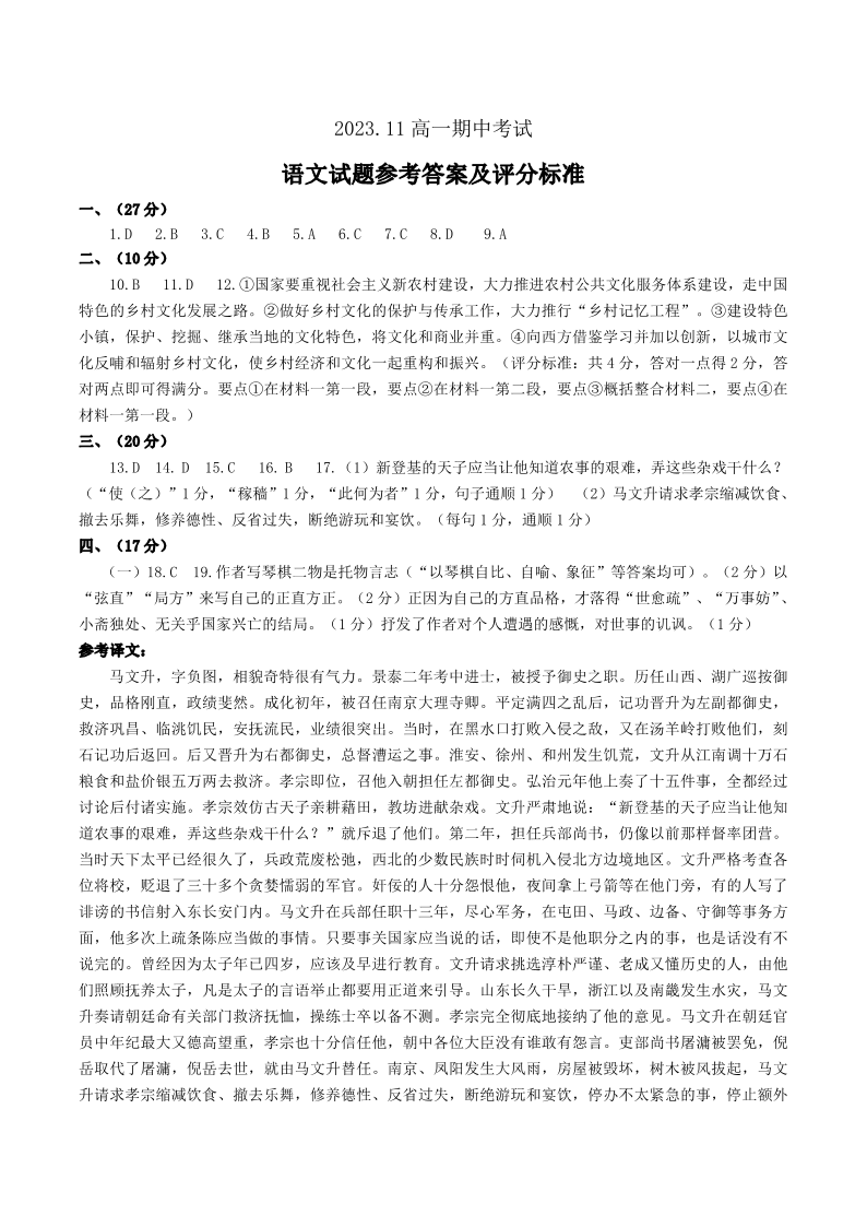 山东省名校考试联盟2023-2024学年高一上学期期中考试语文答案
