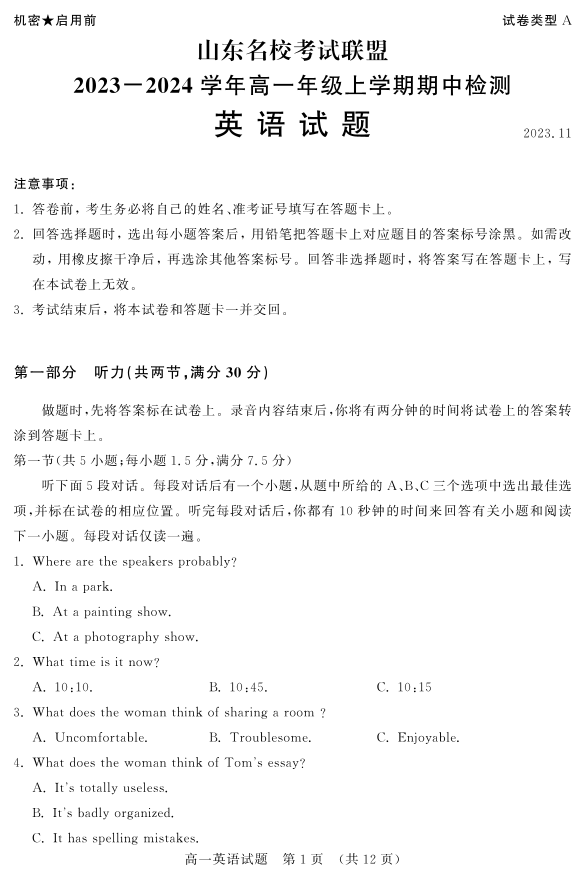 山东省名校考试联盟2023-2024学年高一上学期期中考试英语