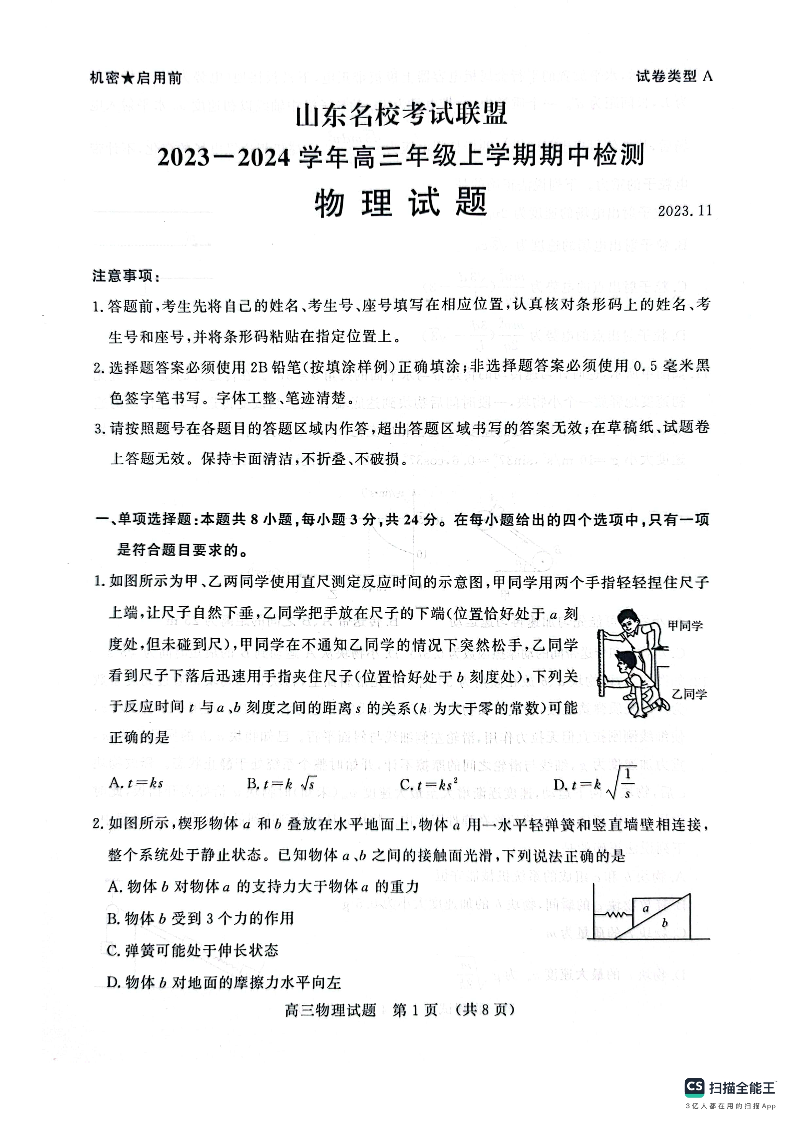 山东省名校考试联盟2023-2024学年高一上学期期中考试物理