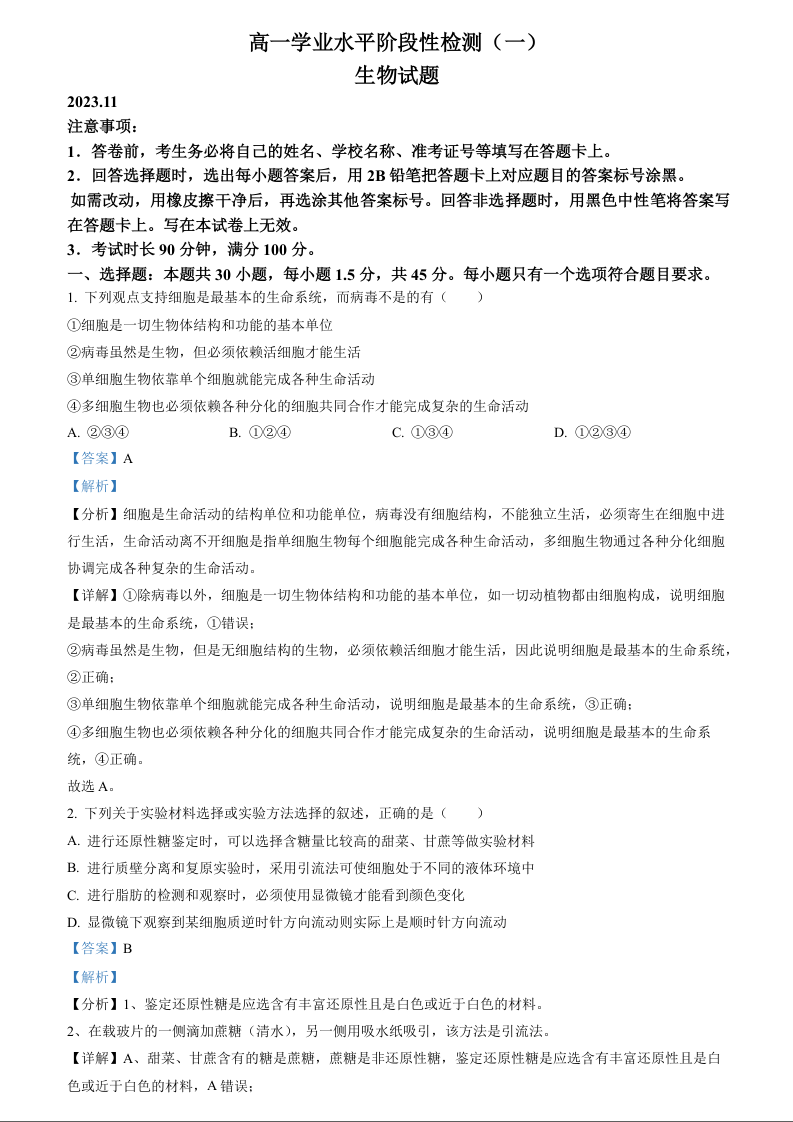 山东省青岛市莱西市2023-2024学年高一上学期11月期中考试生物(精品解析版)