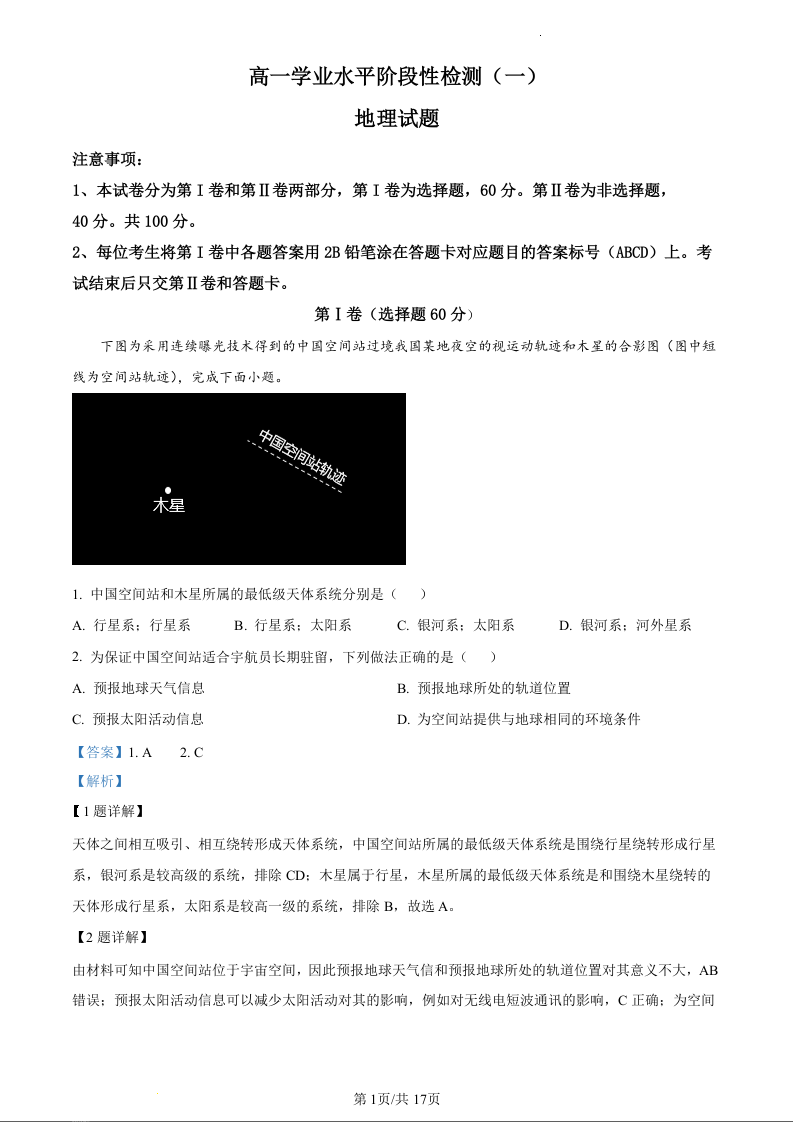 山东省青岛市莱西市2023-2024学年高一上学期11月期中考试地理(精品解析版)
