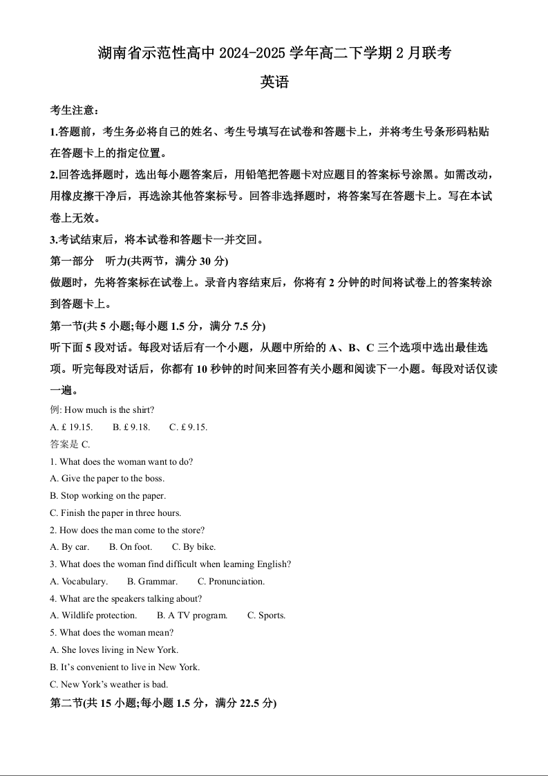 湖南省示范性高中2024-2025学年下学期2月高二联考英语+答案
