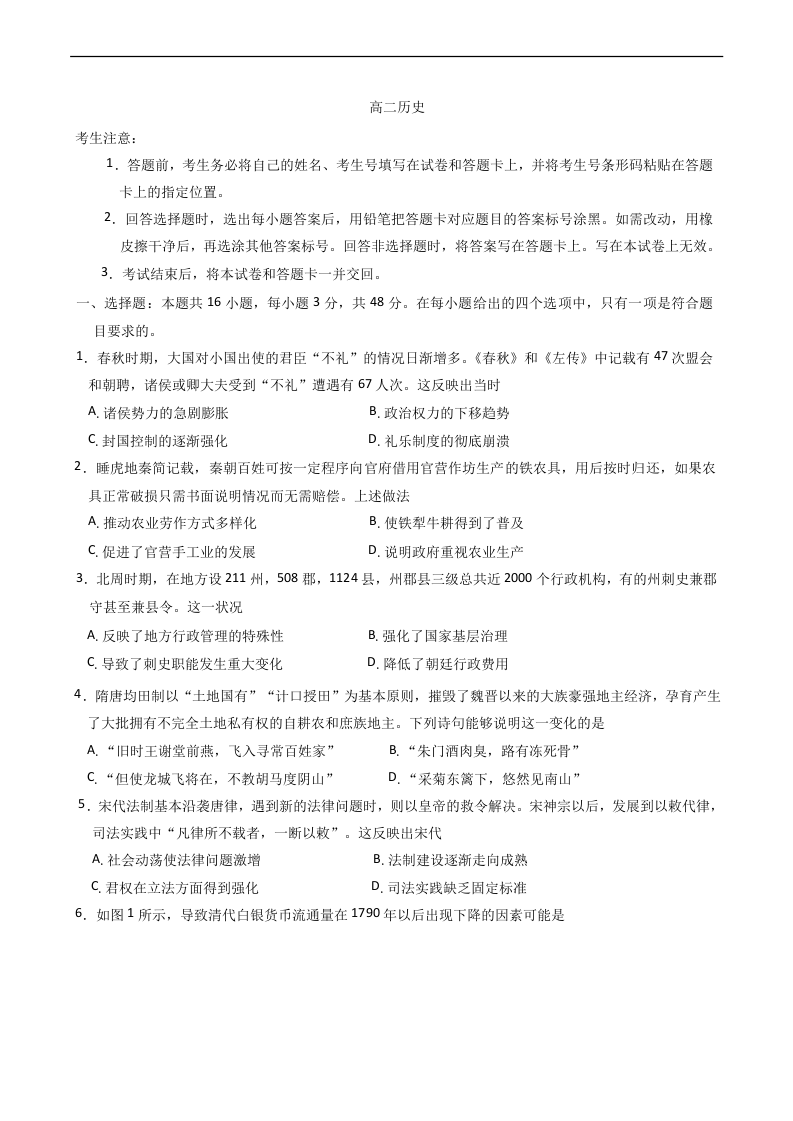 湖南省示范性高中2024-2025学年下学期2月高二联考历史+答案