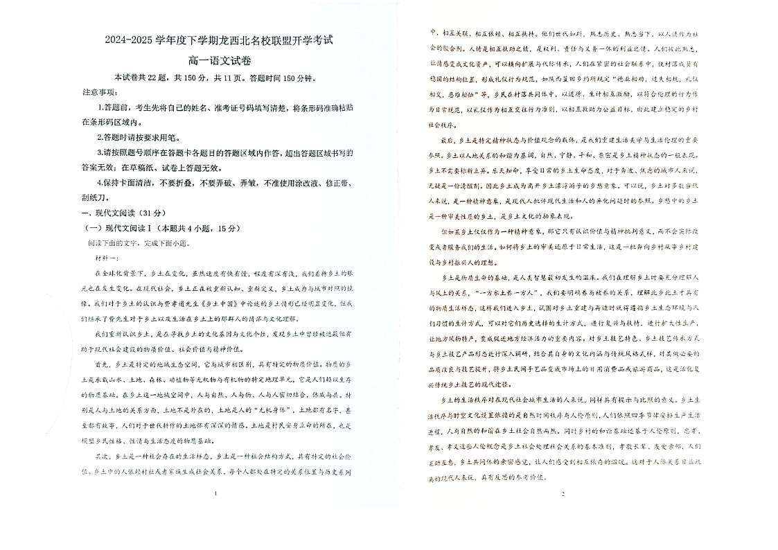 黑龙江省黑河市区域2024-2025学年下学期高一开学考试语文