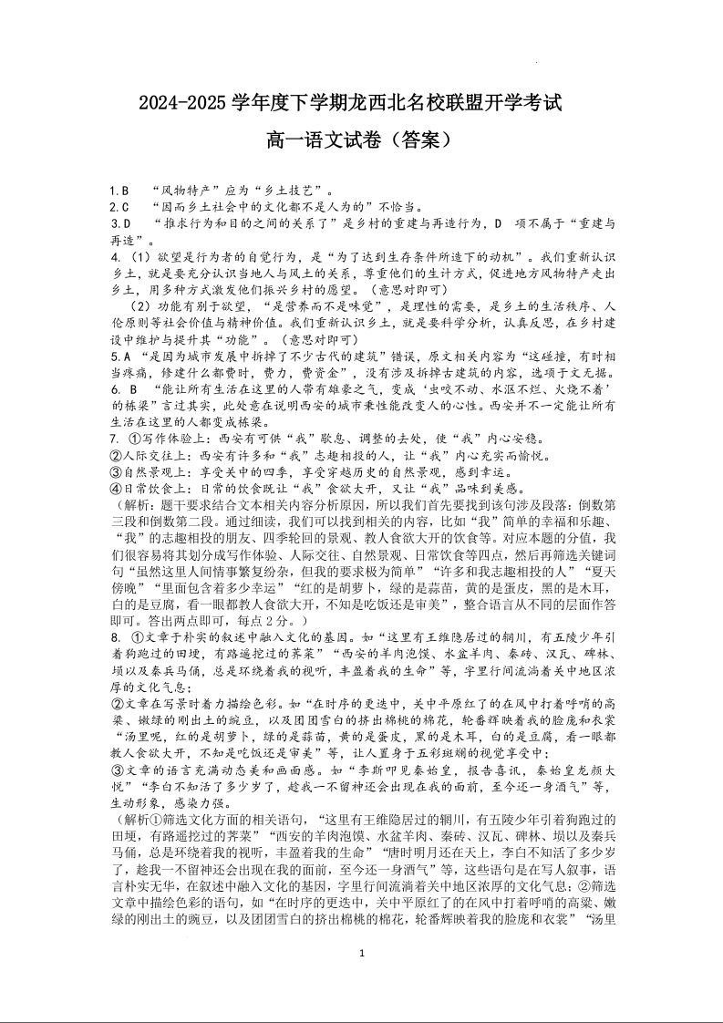 黑龙江省黑河市区域2024-2025学年下学期高一开学考试语文答案