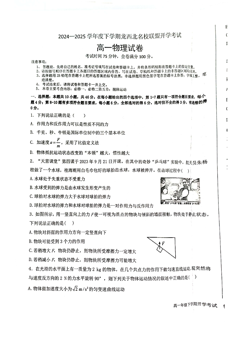 黑龙江省黑河市区域2024-2025学年下学期高一开学考试物理
