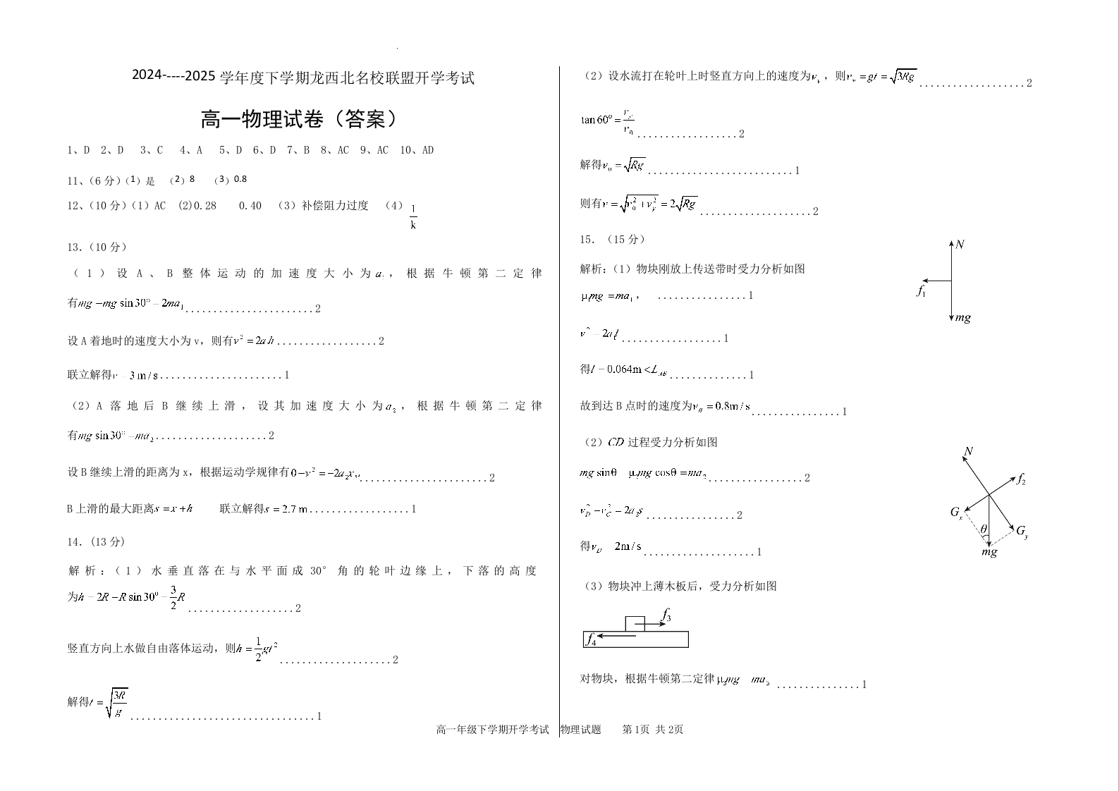 黑龙江省黑河市区域2024-2025学年下学期高一开学考试物理答案