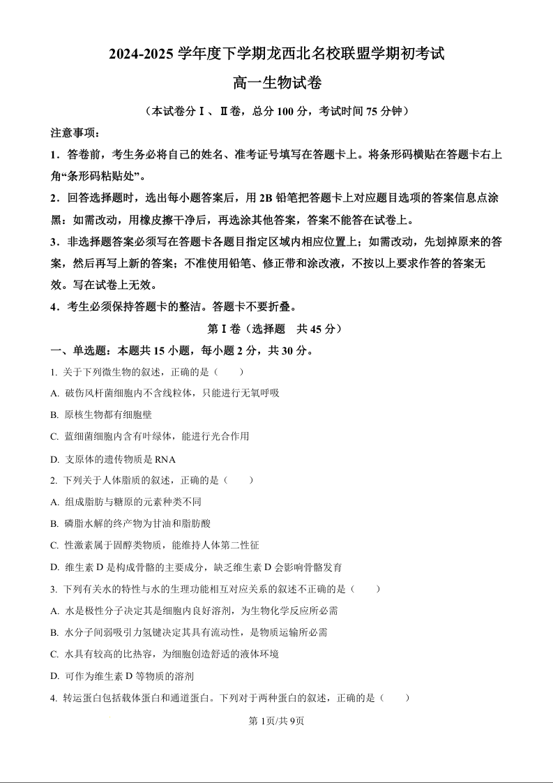 黑龙江省黑河市区域2024-2025学年下学期高一开学考试生物(原卷版)