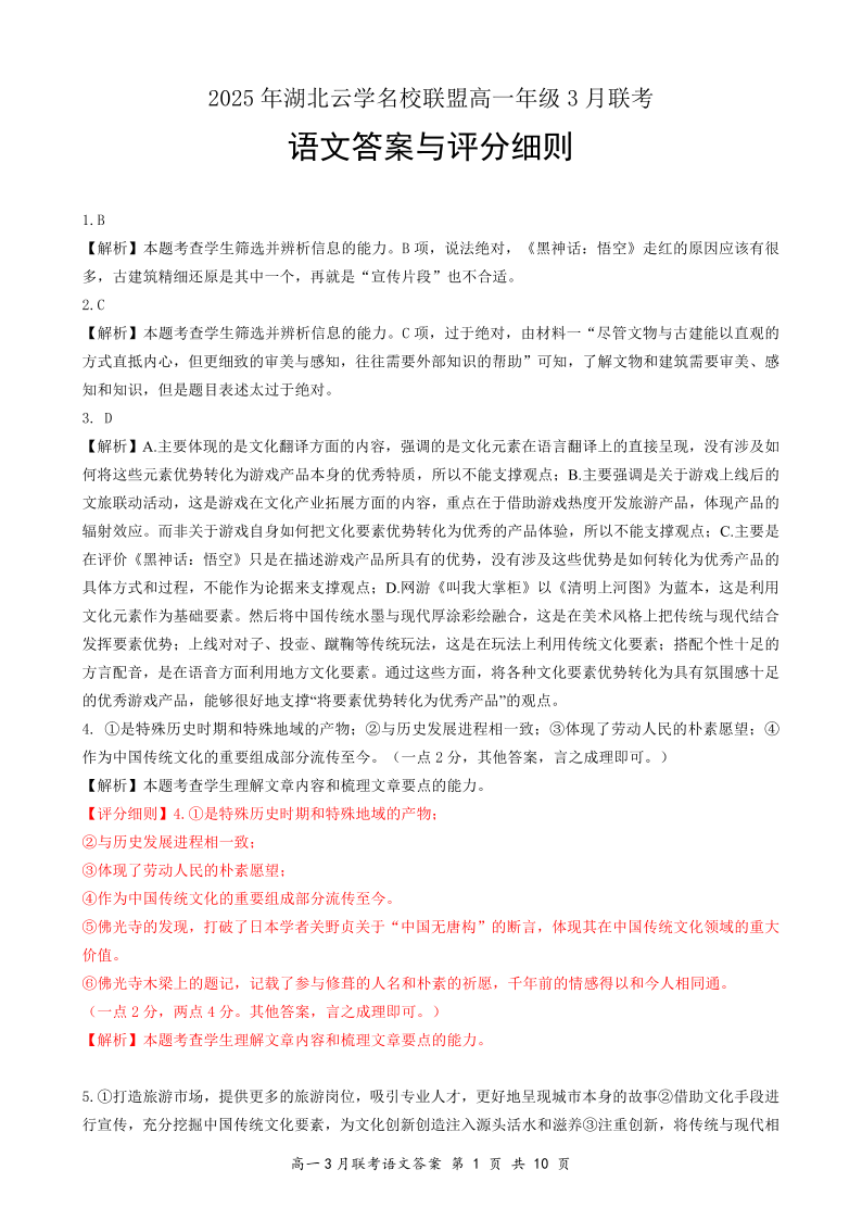 湖北省云学名校联盟2024-2025学年下学期3月高一联考语文答案